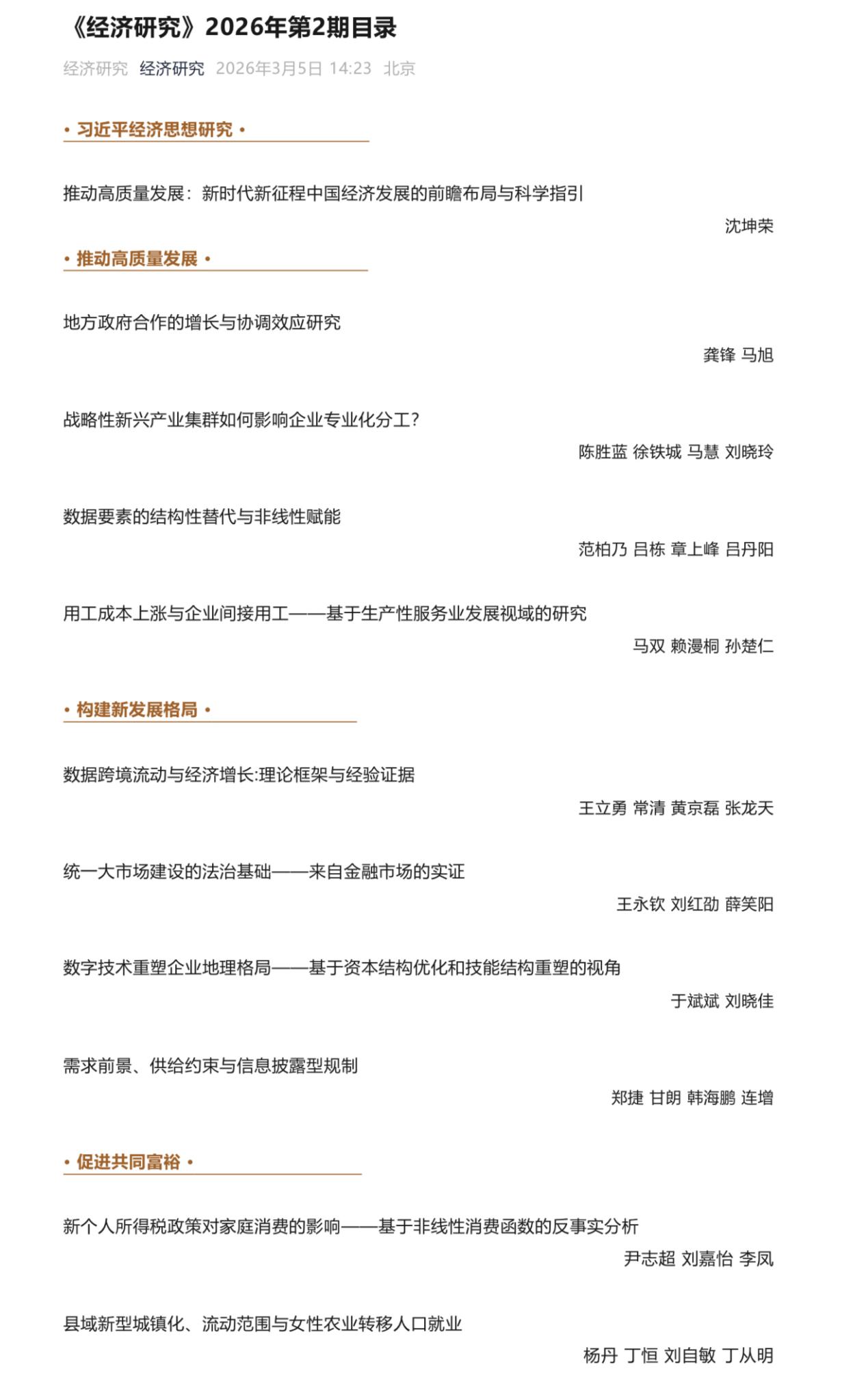 近日,我院郑捷教授、博士生甘朗同学、清华大学经济管理学院韩海鹏博士与北京外国语大学国际商学院连增副教授合作的成果“需求前景、供给约束与信息披露型规制”发表于《经济研究》2026年第2期。这是《经济研究》发表的首份关于信息设计的理论研究,也是郑捷教授团队在中文学术期刊发表的第二份关于信息设计的理论研究(另一份研究发表于《经济学(季刊)》2025年第6期)。《经济研究》是中国经济学领域的顶级期刊,代表了中国经济学研究的最高水平,1955年创刊,由中国社会科学院主管、中国社会科学院经济研究所主办。