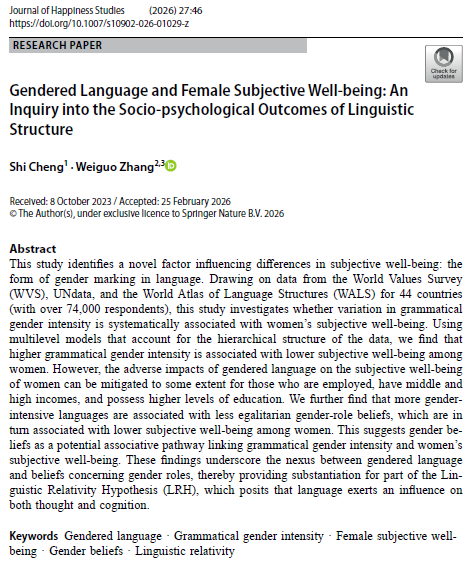 论文信息:Cheng, S., & Zhang, W.(2026). Gendered Language and Female Subjective Well-being: An Inquiry into the Socio-psychological Outcomes of Linguistic Structure.Journal of Happiness Studies,27, 46. https://doi.org/10.1007/s10902-026-01029-z