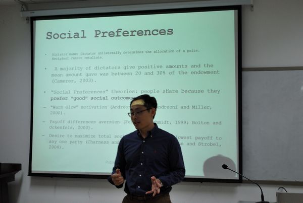 2015年6月29日,经济研究院第53期Seminar顺利举行。来自新加坡管理学院的张剑霖博士在邵逸夫科学馆513教室为经研院师生作了题为Putting a Price Tag on Others’Perceptions of Us的报告。丁洁瑶老师主持了报告会。在报告中,张剑霖博士通过dictator game展开话题,通过实验的方法来评估是否人们关心他人对自己的看法。在标准经济理论假设中,人是自私的,幸福感仅仅是来源于收入的增加或减少,而非他人的评价。然而,大量的社会学和社会心理学研究表明,自我认同的发展是通过的理解是怎样被其他人感知得到的。这份报告使用了looking-glass self的概念框架,利用BDM机制中的变量引出依附于参与者认知的货币价值,表明了在环境中,自私的个体表现出强烈的负面认知来避免那些即使不会影响他们货币回报的看法,即愿意花大价钱来避免所谓的负面印象。最后,张剑霖博士与在座的老师同学们交流了在国外学习生活与国内的不同之处,并希望同学们在听课学习之外,合理安排自己的生活节奏,在生活中发现更多new ideals。